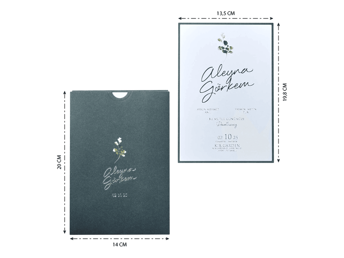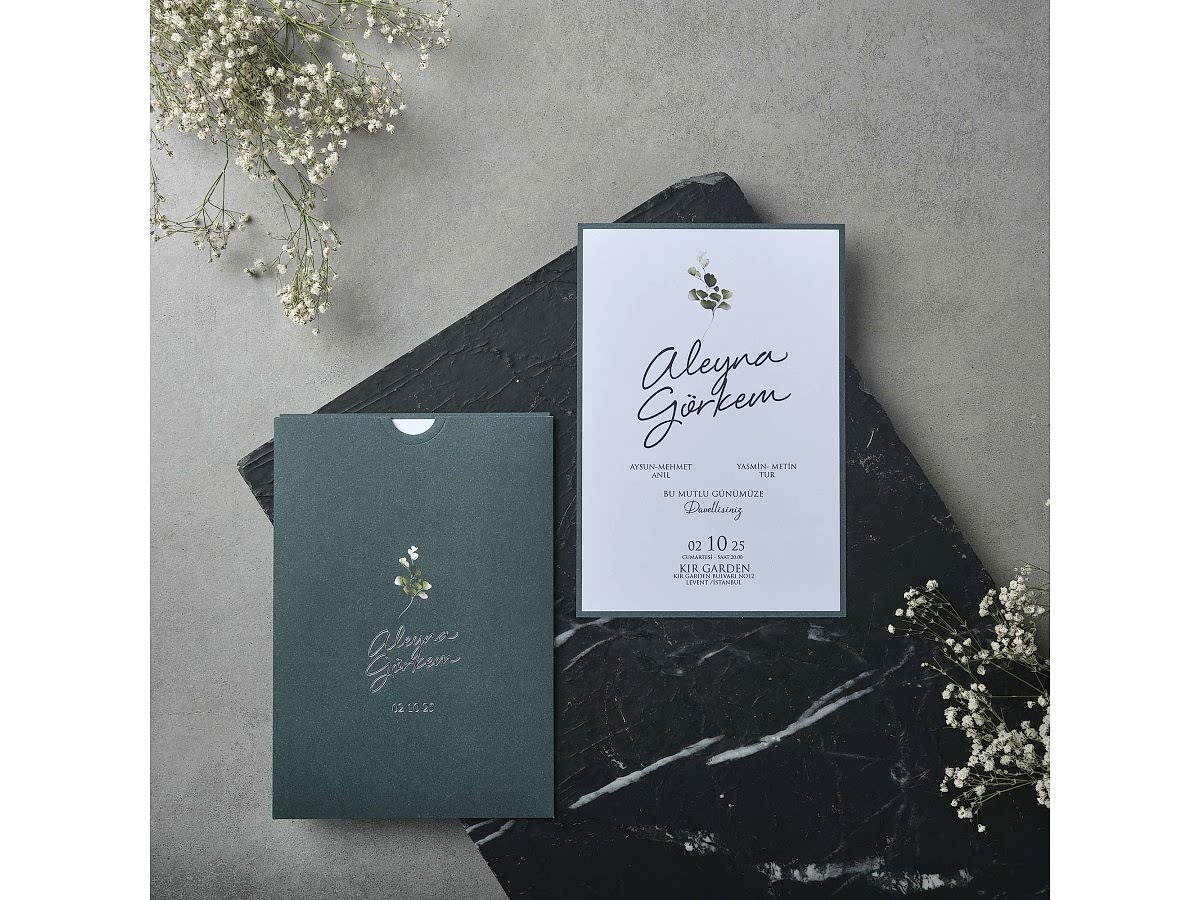 Yeşil zarfın üzerine gelin ve damat isimleri gümüş yaldız baskı uygulanmıştır. İç kısmı zarf ile takım olarak tasarlanmış çiçek detaylı yeşil davetiye.